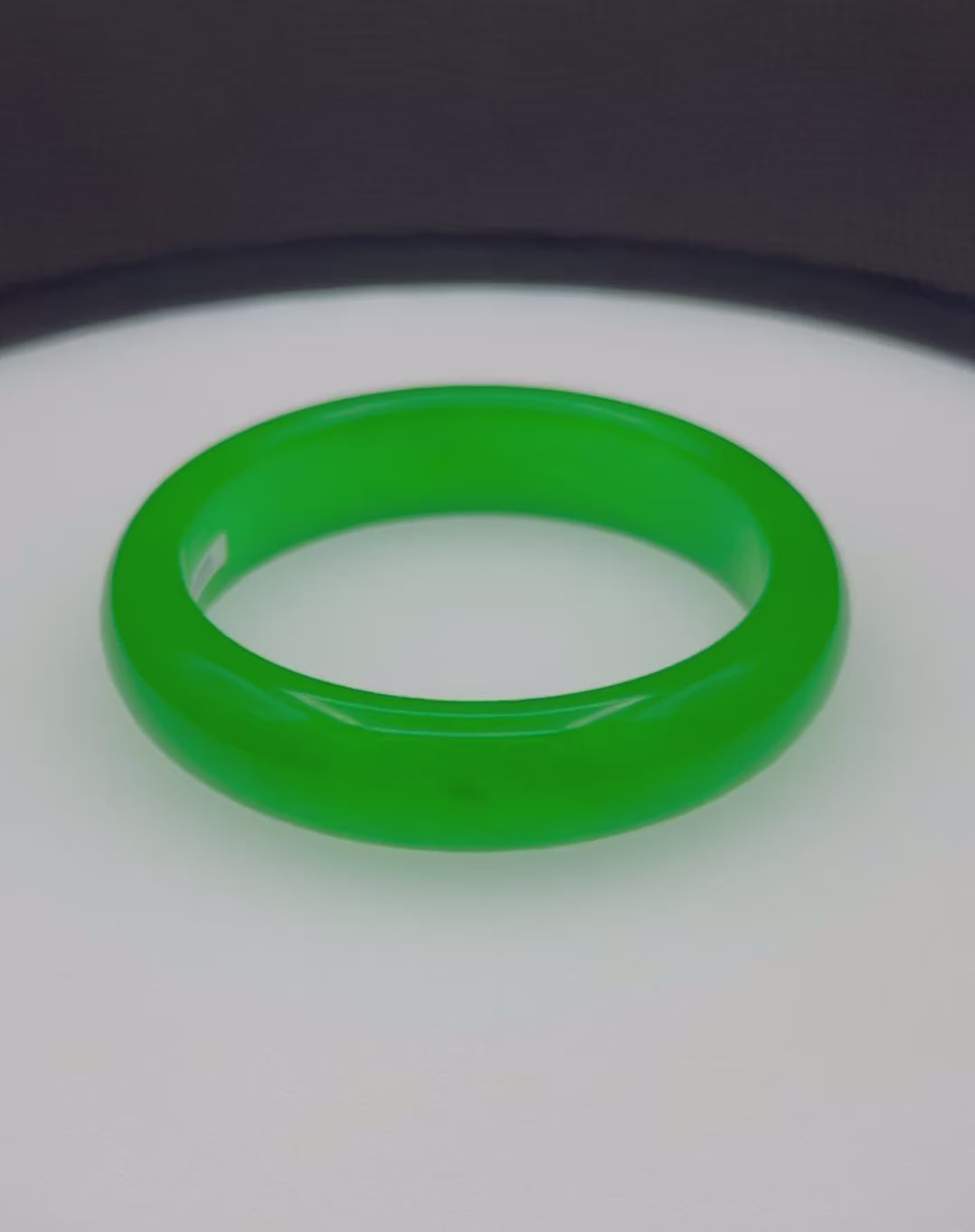 This exquisite bracelet is crafted from genuine green jade, sourced from Yunnan, China. Showcasing an extraordinary emerald green hue. The inside diameter measures 59.5mm. This elegant jade bracelet combines charm and sophistication, making it a perfect addition to any collection.