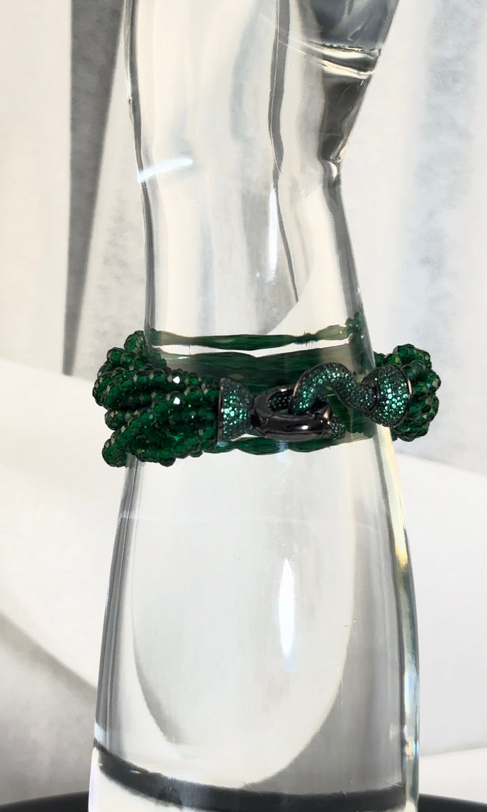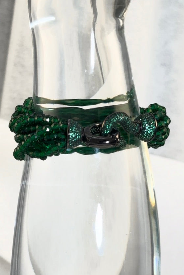 The Green Swarovski bracelet is a charming accessory that enhances any outfit style. It features 10 strands of 3mm green Swarovski cut stones that sparkle beautifully. This bracelet measures 7.5" or, when twisted, 6.5". A recommended wrist size of 5.5 inches or up to a wrist size of 6.5 inches. It is elegantly finished with a hook-design clasp, which is plated and adorned with dazzling green crystals, making for an impressive closure.