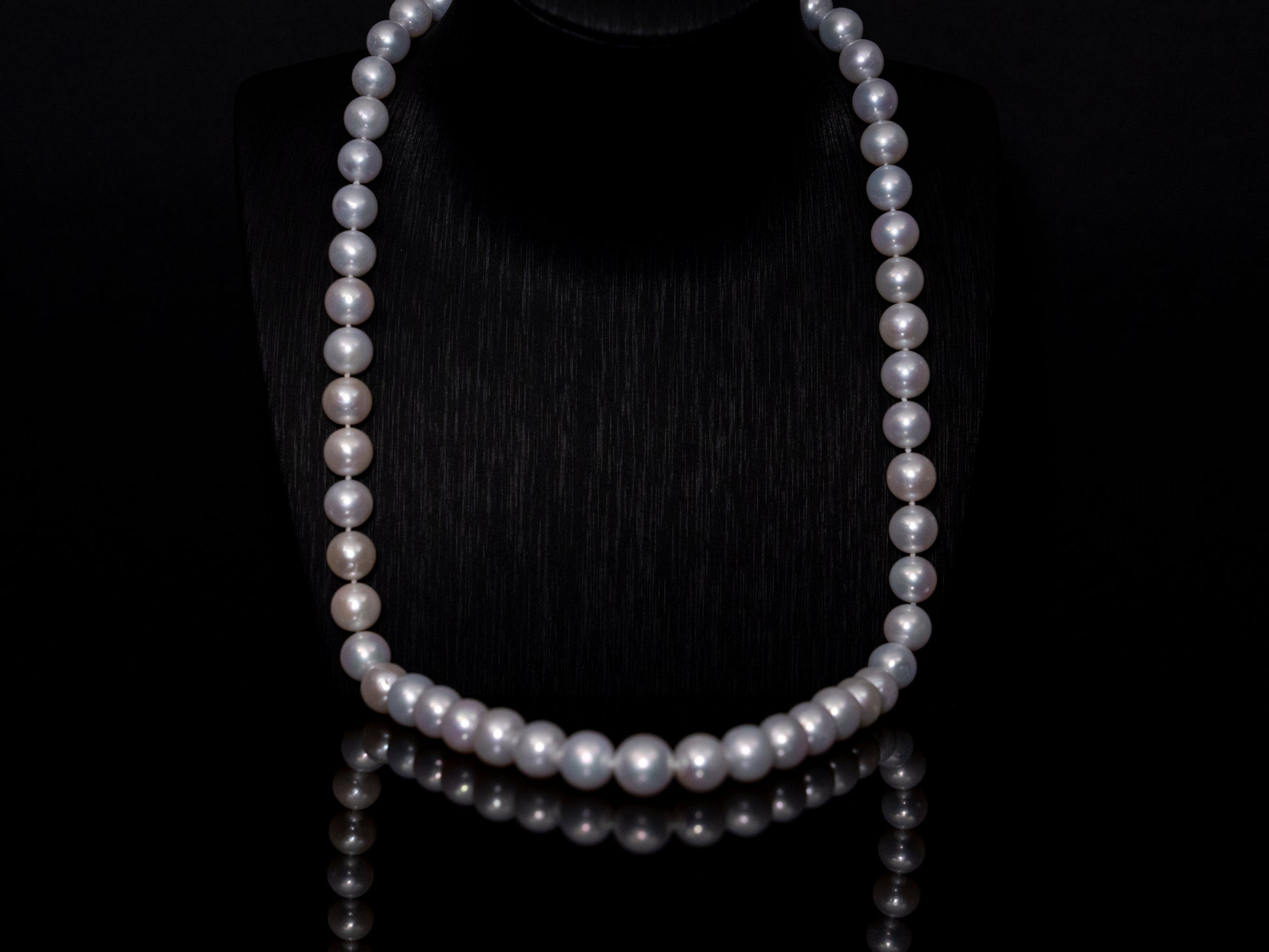 This necklace boasts saltwater South Sea cultured pearls, celebrated for their intense white hue. Each pearl is 100% real, with 95% to 100% of the surface visually clean, providing an excellent mirror-like reflection and extremely sharp, crisp edges. The pearls have thick nacre, giving them a rich, reflective depth and a beautiful aura. They exhibit slight to no variations in color, tone, shape, or size, ensuring a uniformly stunning appearance.