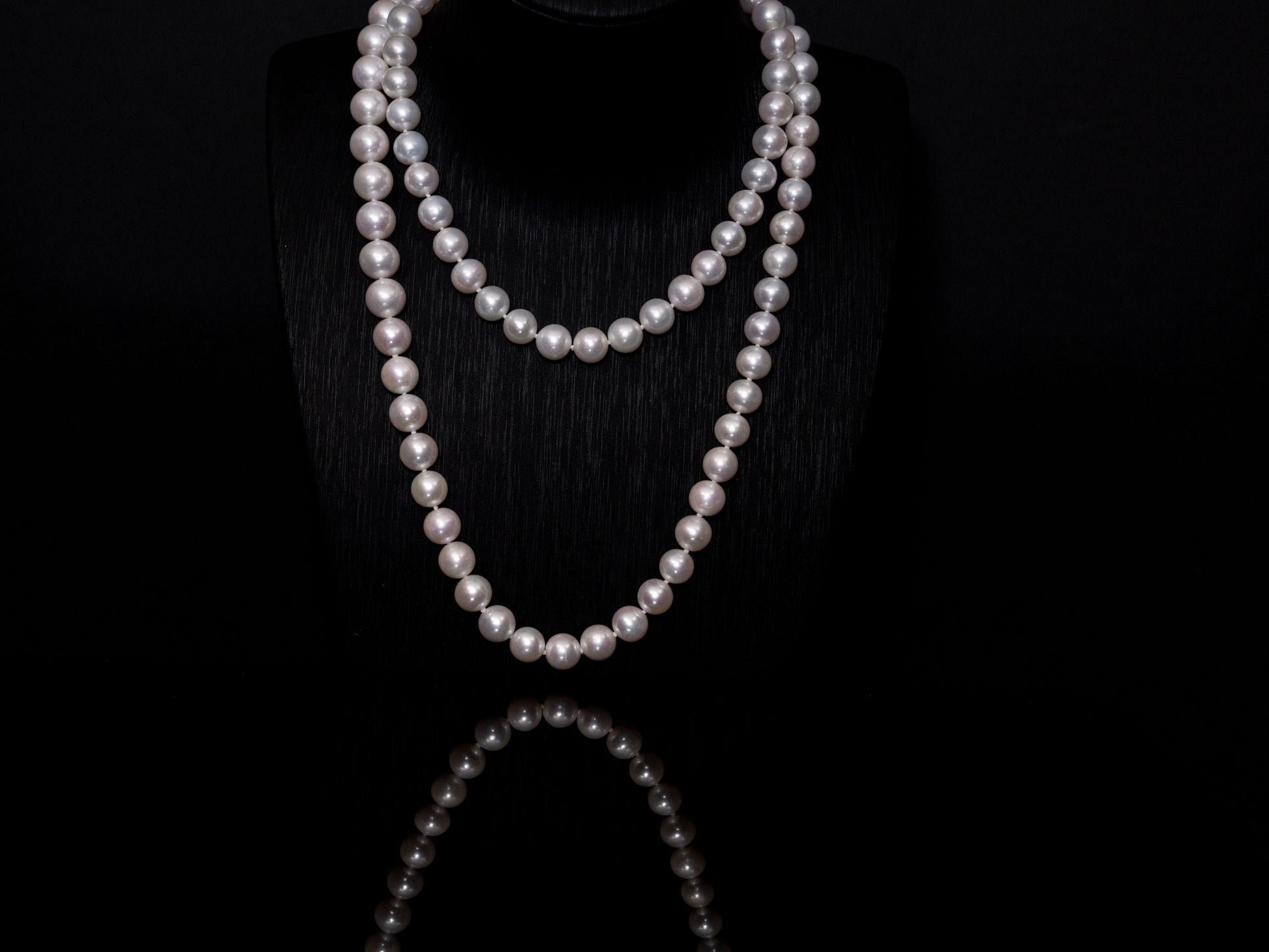 Add a touch of elegance to your wardrobe with our AAAAA-grade South Sea white pearl necklace. This fabulous necklace features 9-10.5mm pearls, celebrated for their natural, pristine white hue and exceptional quality. The 35.5-inch strand features a 14K white gold clasp, allowing you to easily double the strand or knot it for a unique look.