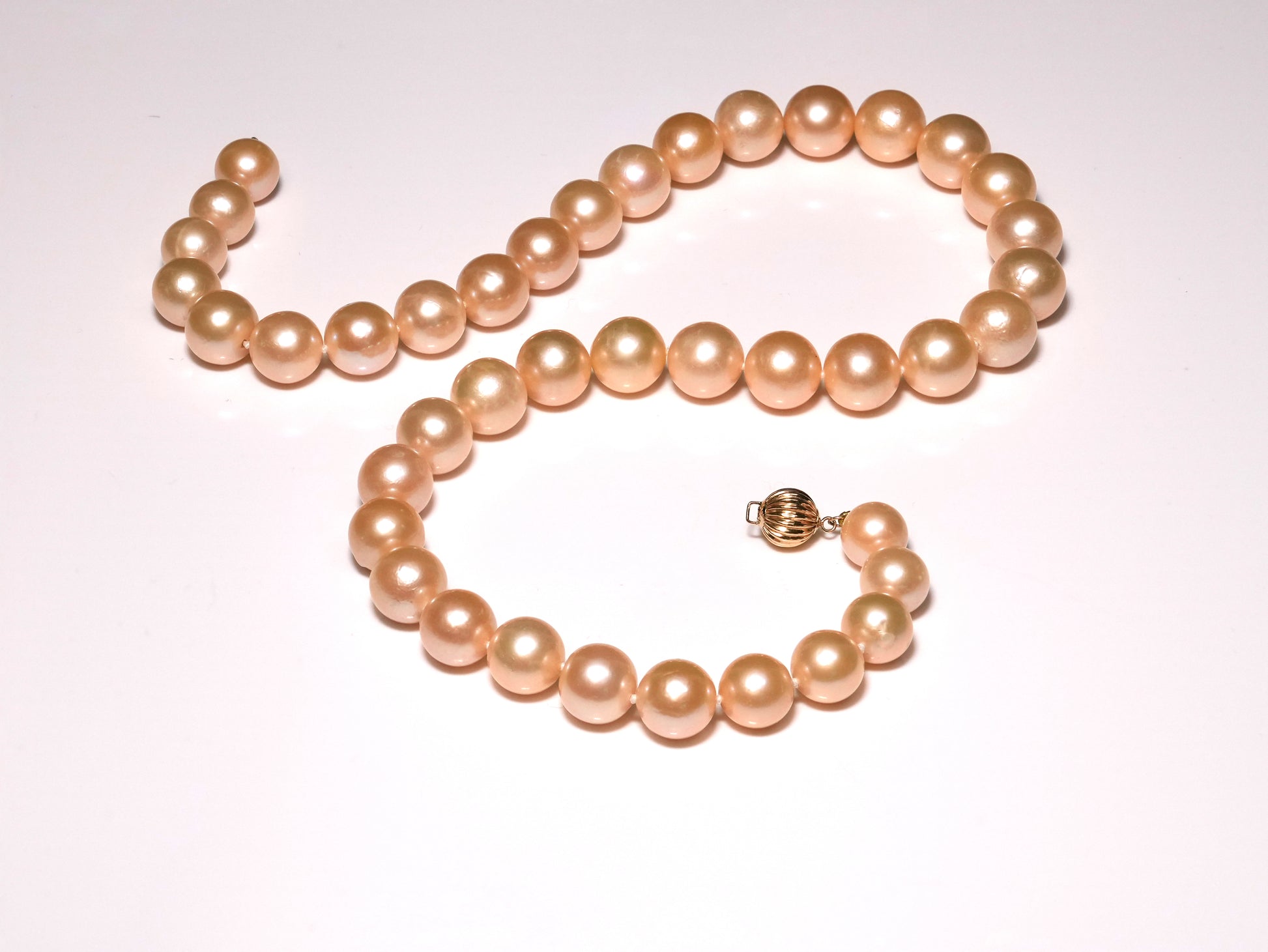 Lovely and suitable for everyday wear, our AAAA-grade South Sea champagne-golden pearl necklace is a flattering and pleasing accessory for any occasion. Featuring 10-12.5mm pearls, this 20-inch strand is elegantly secured with a 14K yellow gold clasp, adding a touch of sophistication to your wardrobe with its natural champagne-soft, warm hue.