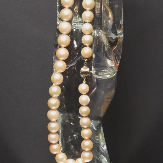 Crafted with saltwater South Sea cultured pearls sourced directly from Australia, this necklace features 100% authentic pearls, with 90% of the surface clean and primarily visually appealing. The thick nacre provides excellent reflection and mostly crisp edges, with some blurring observed, adding to the pearls' unique character. The pearls exhibit a rich reflective depth and lovely overtones, showcasing their genuine champagne pink hue, soft and warm.