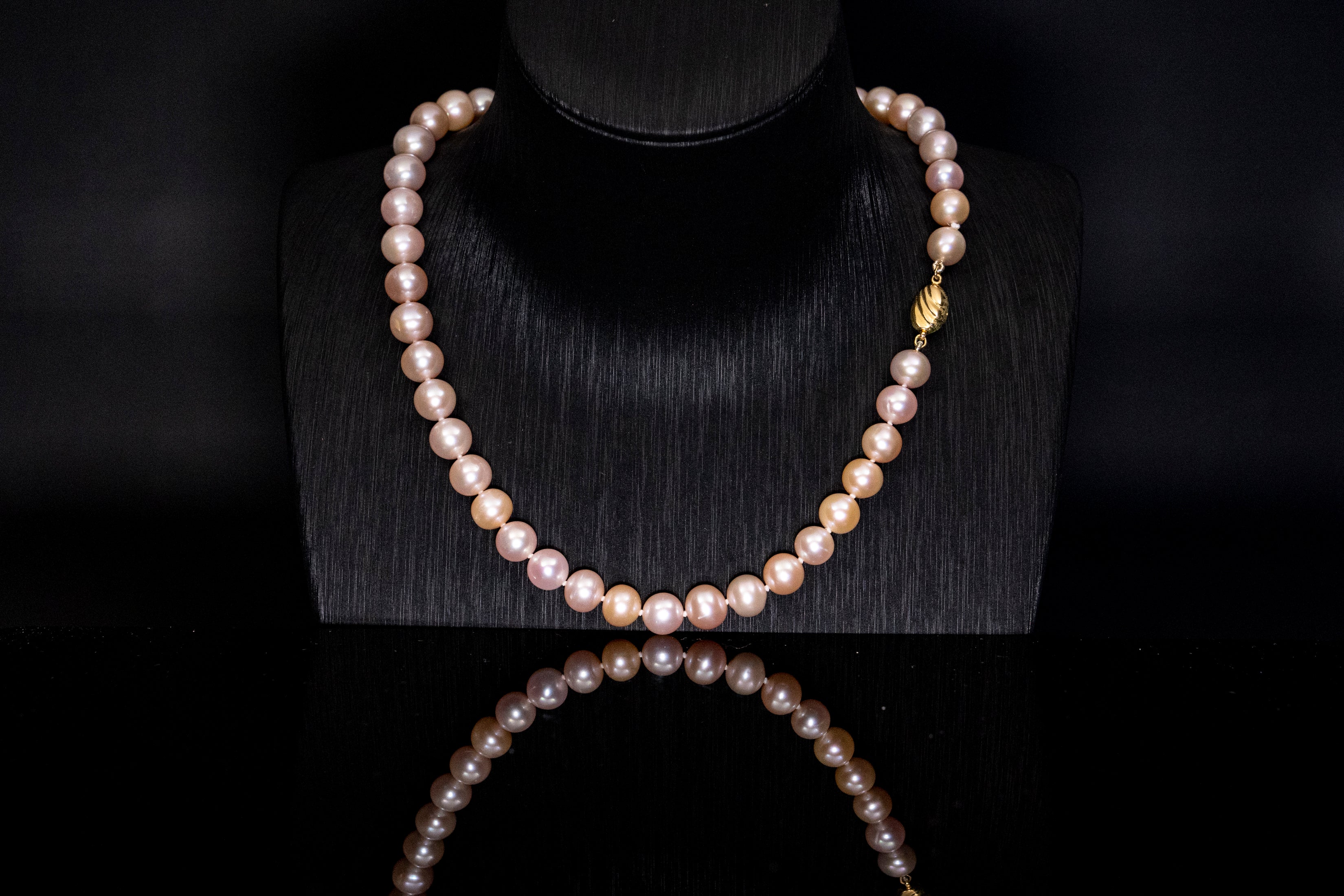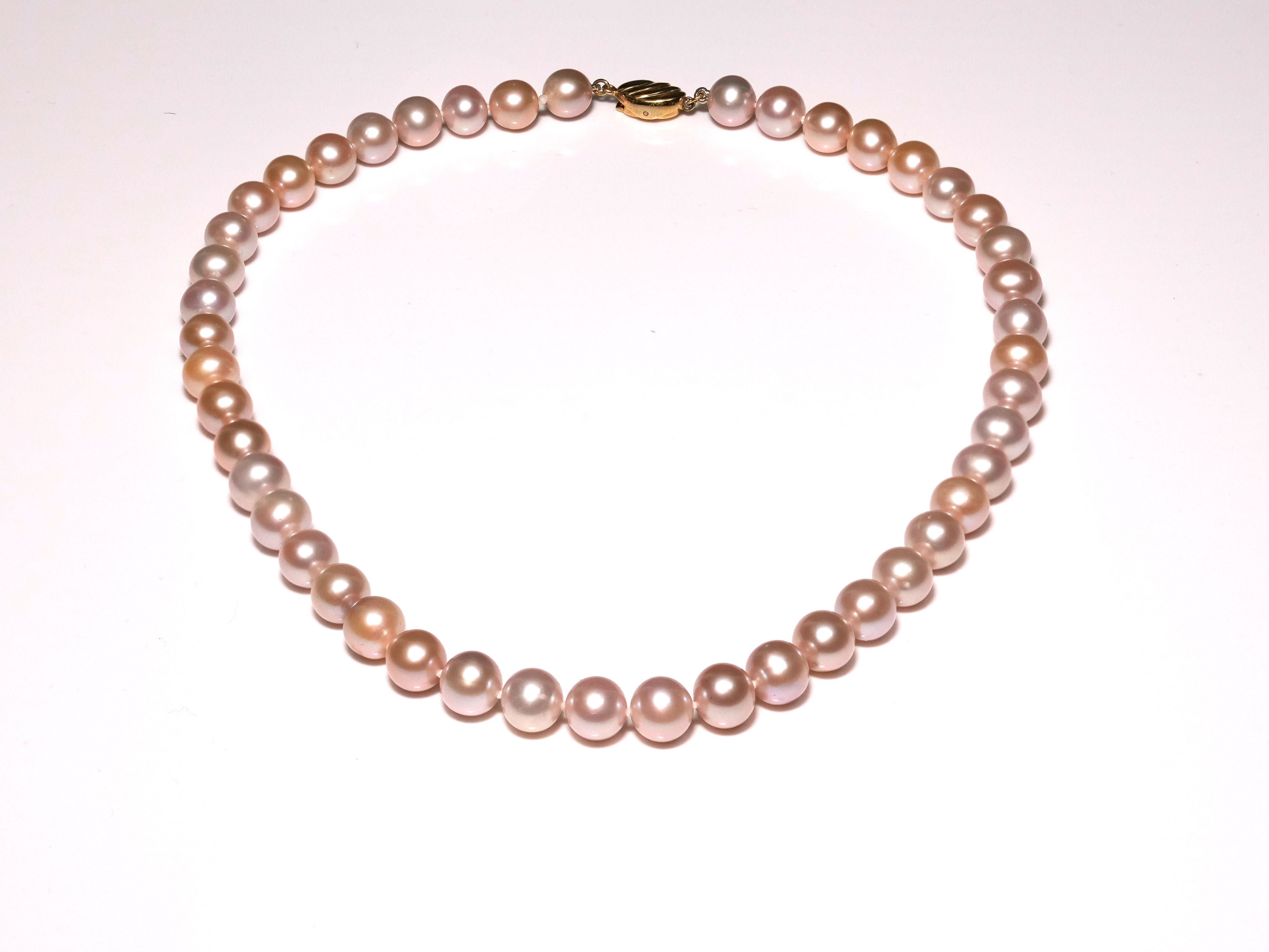 This pleasurable necklace adds a delightful touch to your day or evening style with our AAAAA-grade South Sea soft blush pink necklace. Likable and noticeable, this beautiful piece is a perfect addition to any outfit. Featuring 8.5-9.5mm pearls, the 17-inch strand is elegantly secured with a yellow-gold-plated clasp that highlights its soft pink hue.
