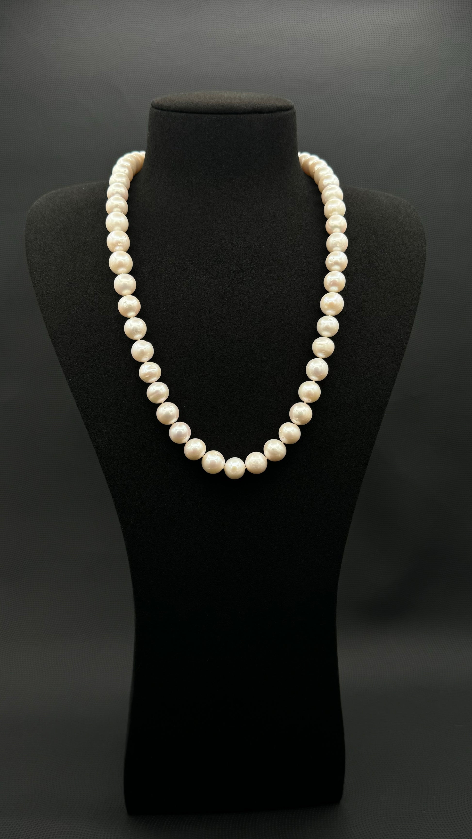 Casual and versatile, our A-fair grade South Sea white pearl necklace is suitable for everyday wear and perfect for any occasion. Featuring 10.5-11mm pearls, this 21.5-inch continuous strand offers an elegant and seamless look with its white hue. This continuous strand features a no-clasp design, making it easy to wear.  FINAL SALE