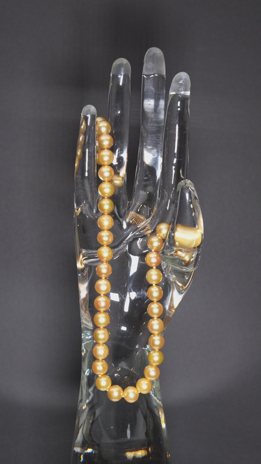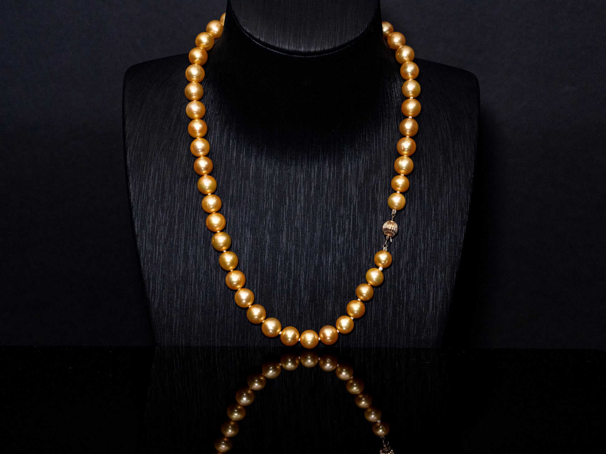Add elegance to your everyday or evening style with our AAAAA-grade South Sea Deep-Gold Pearl Necklace. This fabulous accessory is the perfect choice anytime, making a sound statement with radiant allure. Featuring 9-10mm pearls, the 18-inch strand is secured with a 14K yellow gold clasp, highlighting its stunning natural deep gold hue.