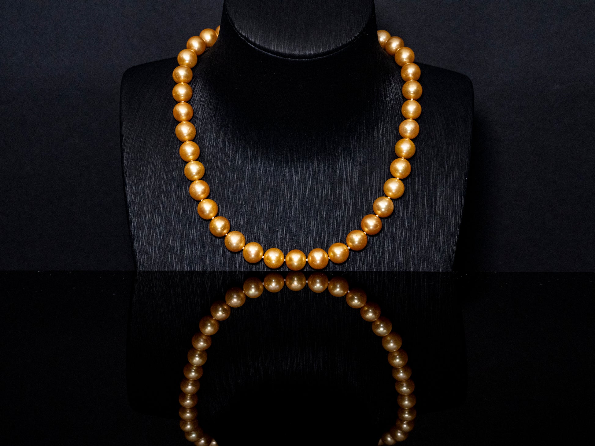 Crafted with saltwater South Sea cultured pearls sourced directly from Australia, this necklace features 100% genuine and predominantly visually clean pearls, with 95% to 100% of the surface flawless. The thick nacre provides excellent reflection and exceptionally sharp, crisp edges, with minimal variations in color, tone, shape, and size. The pearls exhibit a rich reflective depth and beautiful overtones, highlighting their natural deep-gold hue.