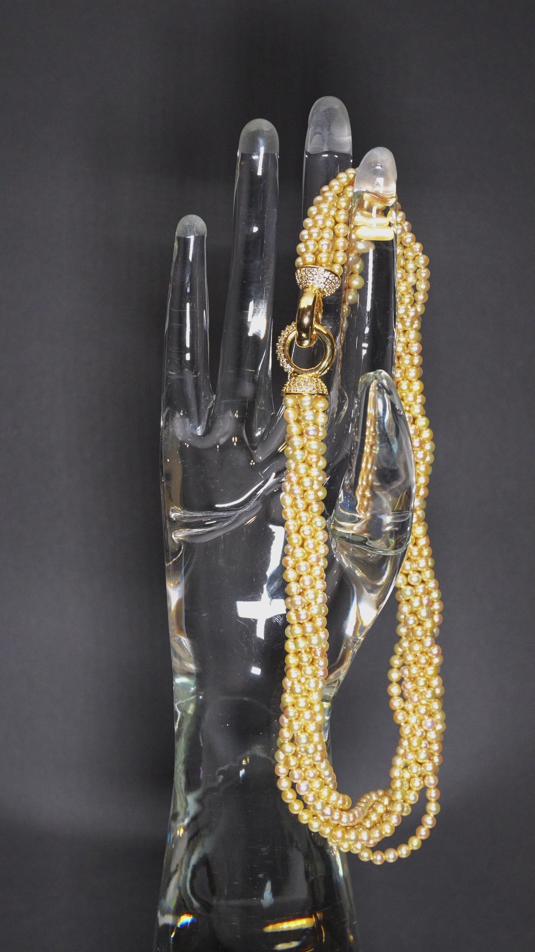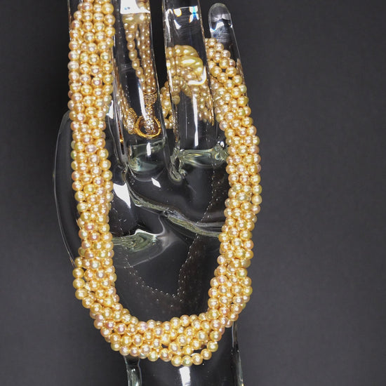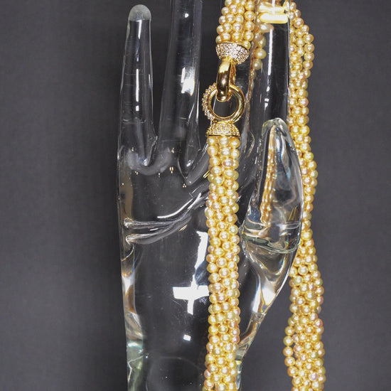 Lift your style with our AAAAA-grade South Sea Golden-Beige Pearl Necklace, an exquisite accessory that adds charm to any outfit. This delightful 17-inch necklace features seven strands of 4-4.5mm pearls, perfect for creating a statement of exceptional quality and natural beauty. The seven strands are elegantly finished with a yellow gold-plated clasp adorned with clear crystal insets, adding a touch of distinction to your look.