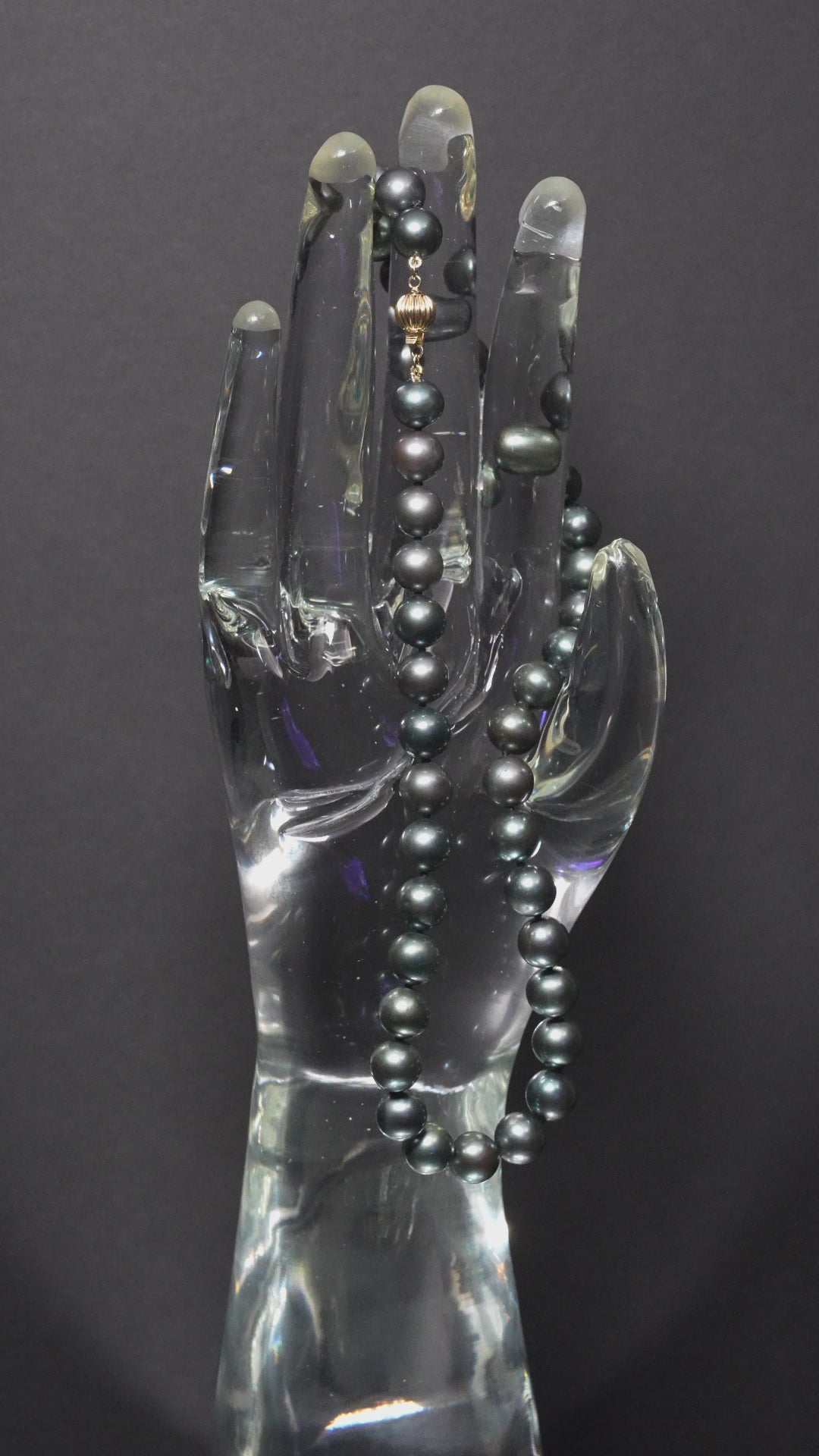 Versatile and suitable for everyday wear, our AAAA-grade Tahitian green pearl necklace is a distinctive accessory that is perfect for any occasion. Featuring 9-9.5mm pearls, this stunning necklace is elegantly finished with a 14K yellow-gold clasp, adding a touch of elegance to your wardrobe with its subtle, viridescent, deep grey-green tone.