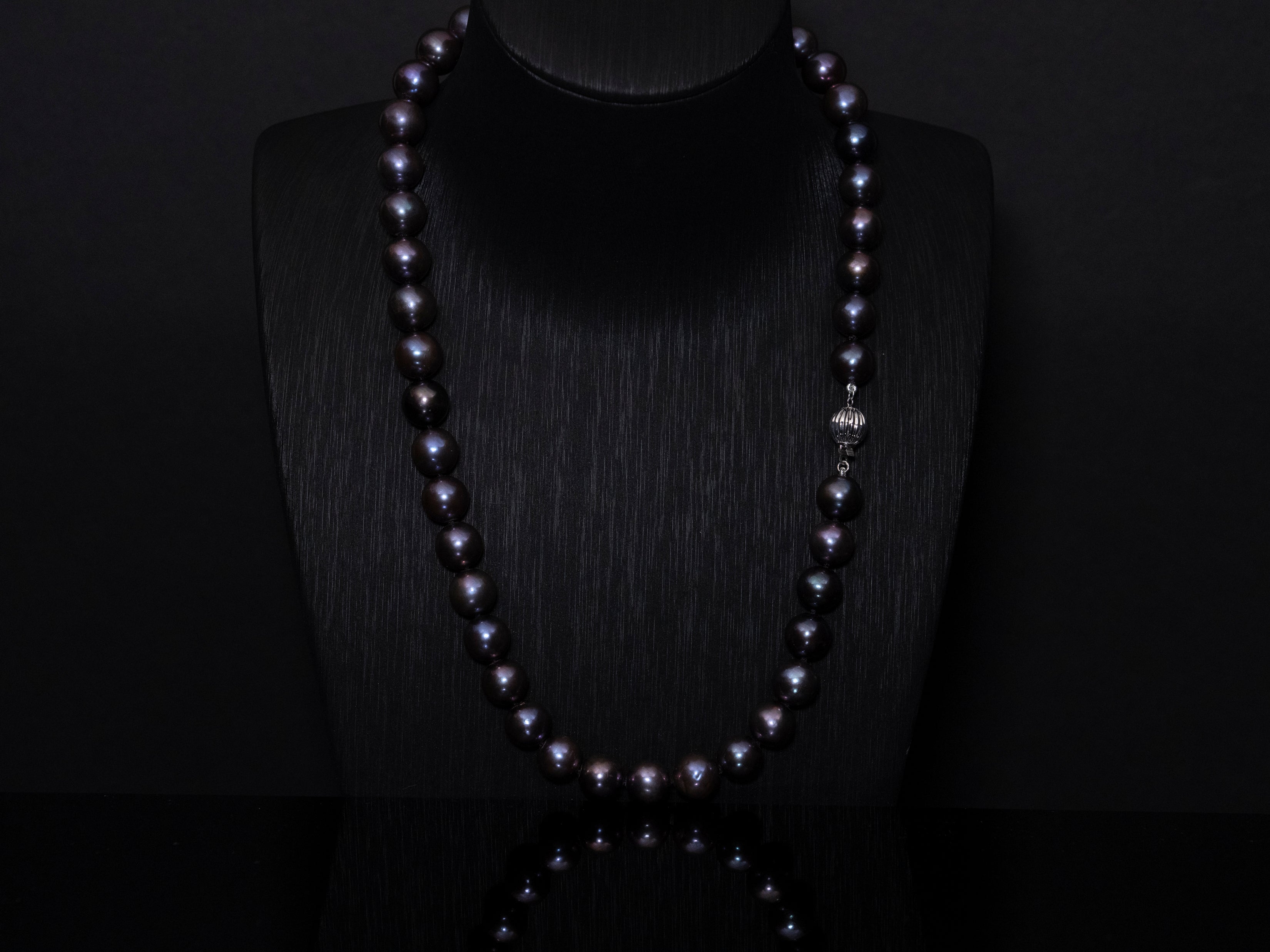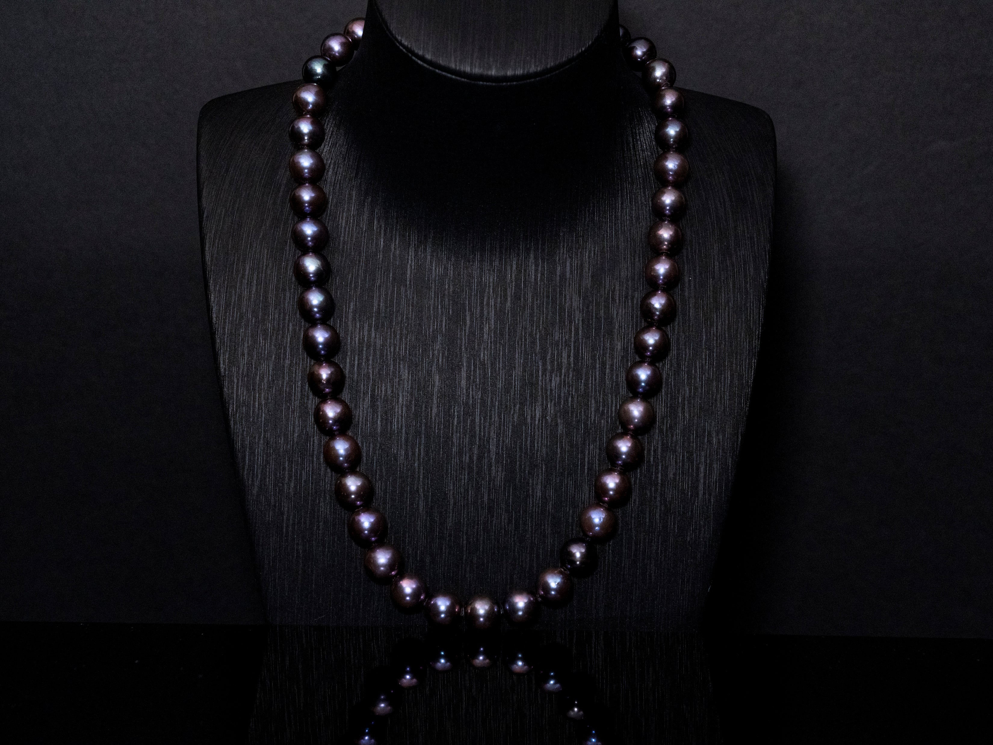 Unique and rare, add this AAAAA-grade South Sea black raspberry pearl necklace to your collection. Perfect for everyday wear and evening events, this stunning piece of jewelry is a memorable choice for any occasion. Featuring 10.5-11.5mm pearls, this 20-inch strand is elegantly secured with a 14K white-gold clasp, showcasing a spectrum of captivating black, purple, violet, and red tones. This is a beauty.