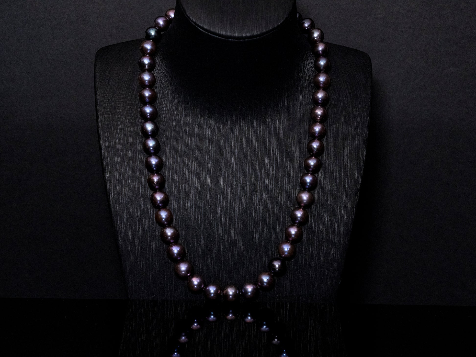 Crafted with Tahitian cultured pearls sourced directly from Tahiti, this necklace features 100% genuine and predominantly visually clean pearls, with 95% to 100% of the surface flawless. The thick nacre provides excellent reflection and outstanding, sharp, crisp edges, with minimal variations in color, tone, shape, and size. The pearls exhibit a rich reflective depth and beautiful overtones, showcasing their gorgeous blend of black, purple, violet, and red tones.