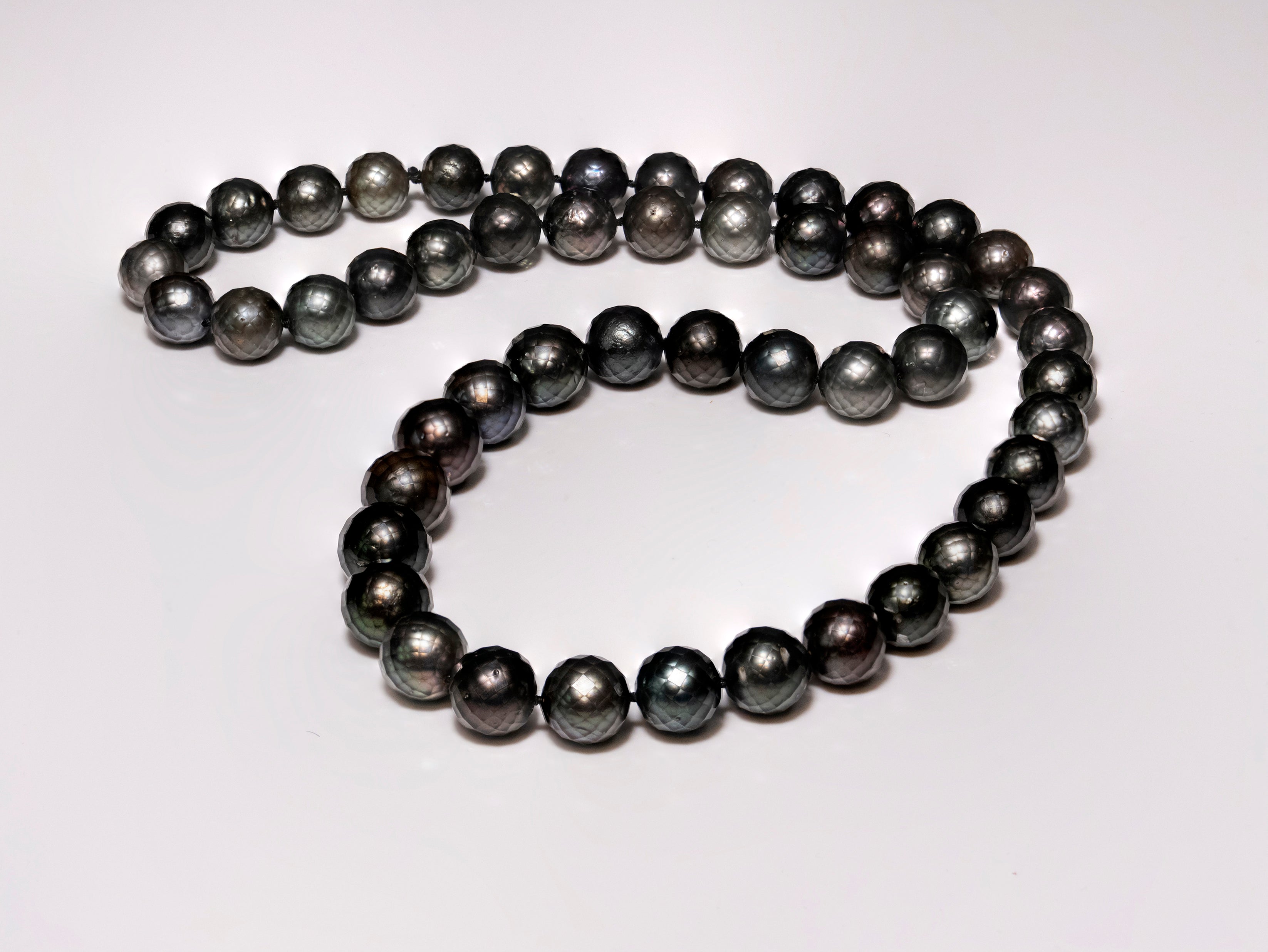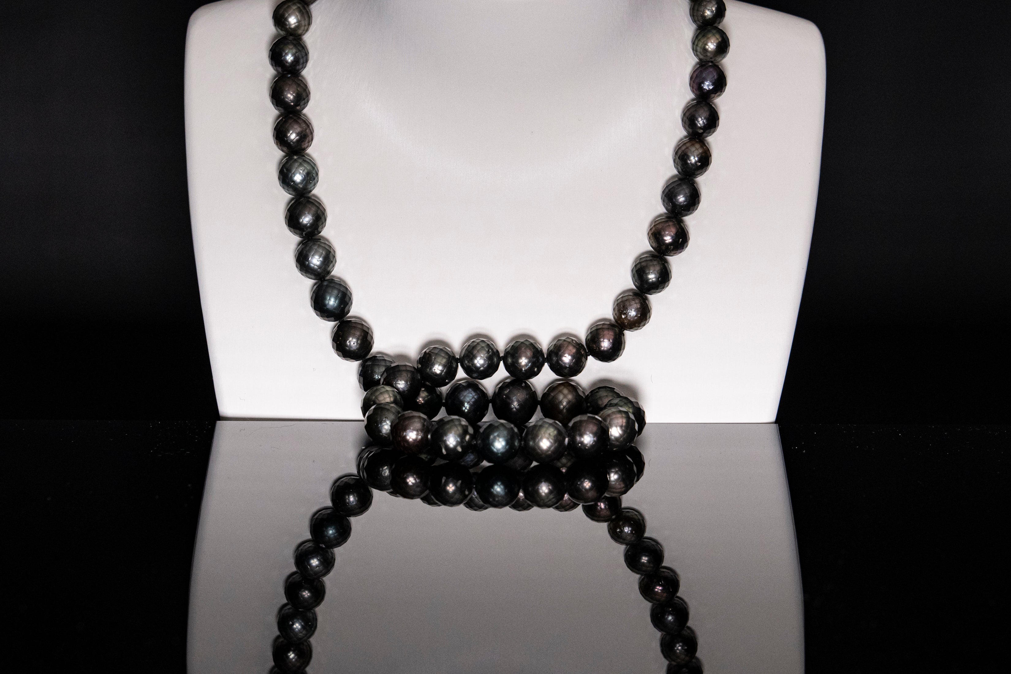 Versatile and ideal for everyday wear, our AAA-grade Tahitian Carved Black-Green Pearl Necklace adds a striking and unique touch to your look. Featuring 10-12.5mm pearls with carved facets that enhance their refined sparkle, this 24-inch continuous strand provides an elegant and seamless look.