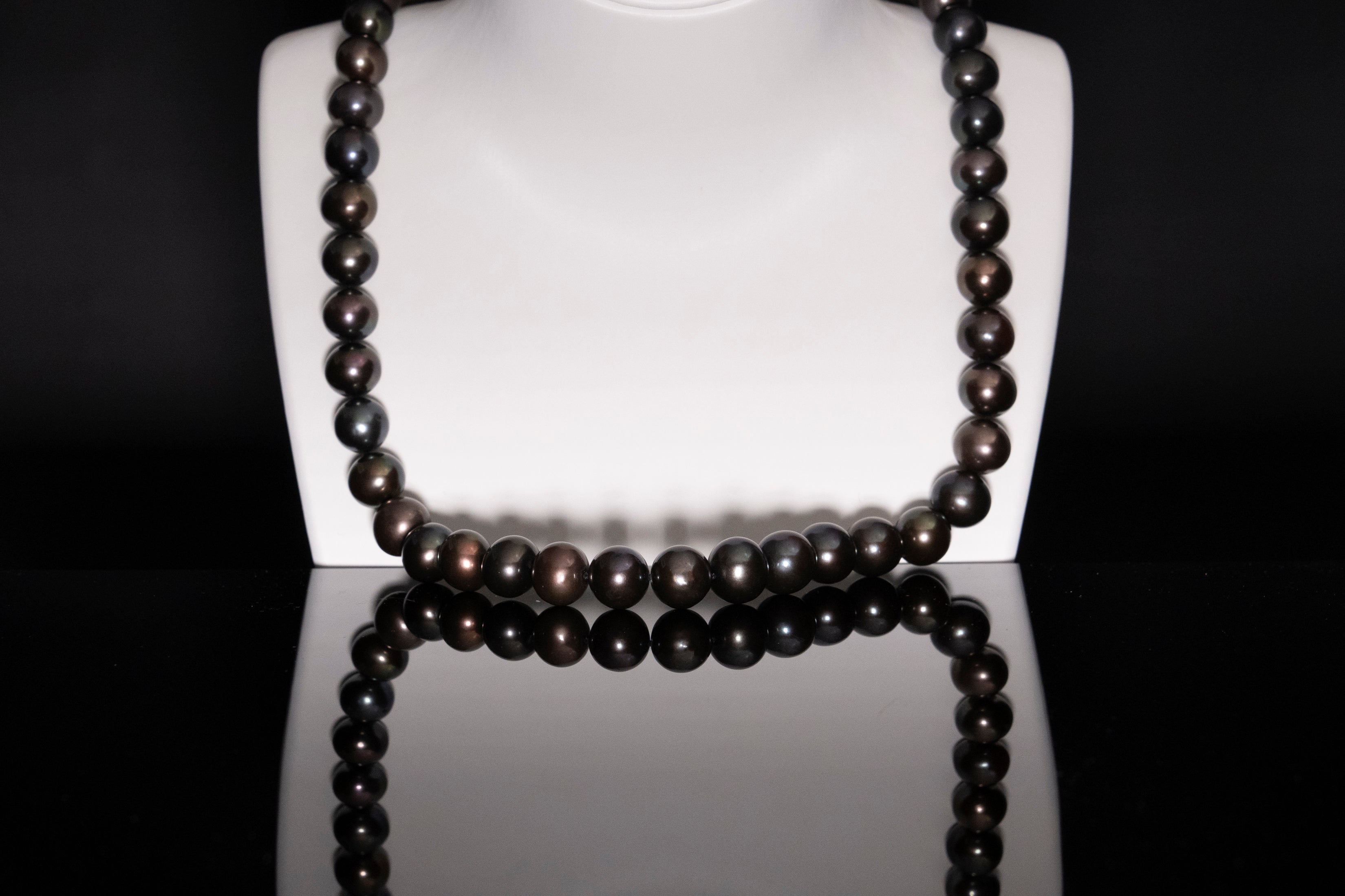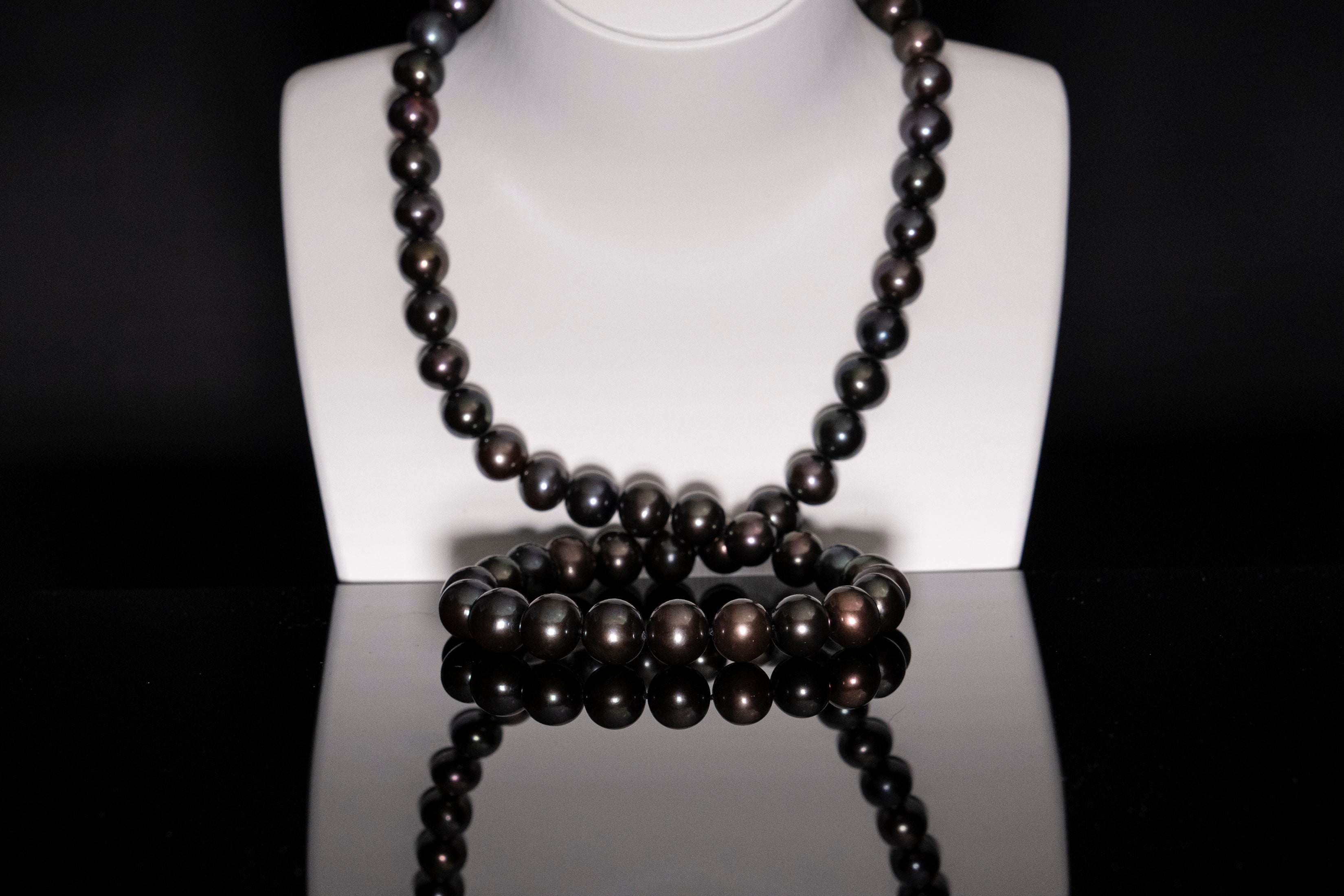 This extraordinary AAAAA-grade Tahitian black pearl necklace adds a special, elegant touch to your special day or evening style, capturing attention with its undeniable beauty. Featuring 11-12.5mm pearls, this 26-inch continuous strand showcases its captivating deep black with slight violet-green hues. This continuous strand features a no-clasp design, making it easy to wear and versatile for any occasion.